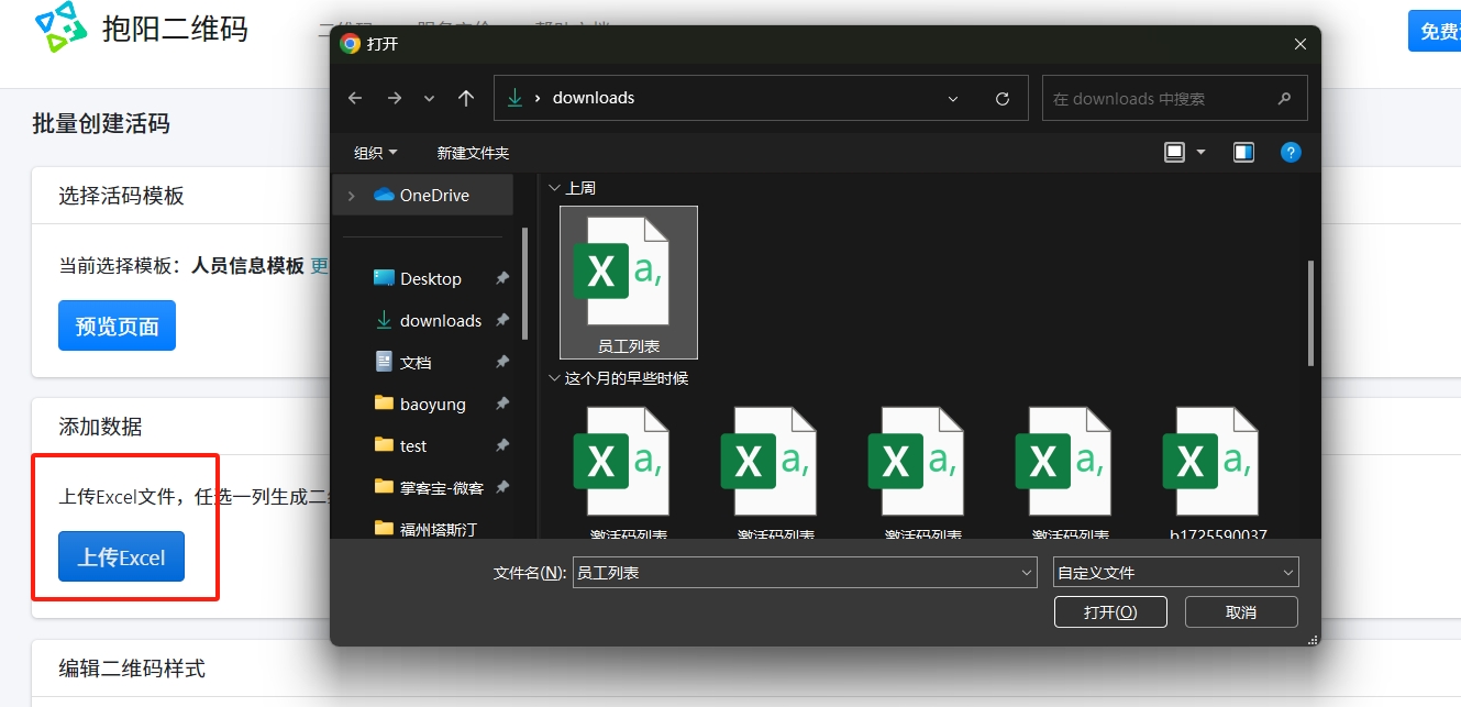 选择上传excel文件,可以把第一列设置为员工姓名,这样容易查找