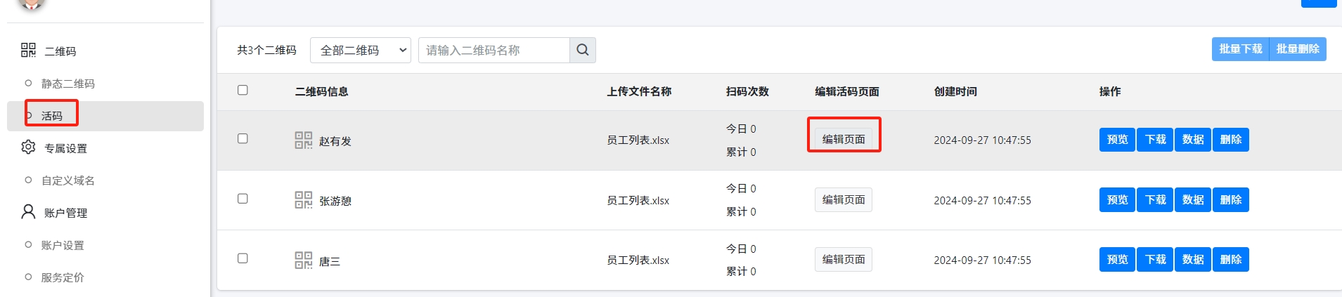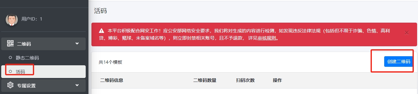 选择左侧菜单中的【二维码】-【活码】