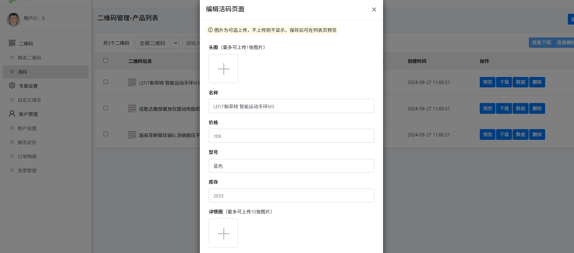 点击【编辑页面】,在里面上传头图、详情图,或者修正二维码内容