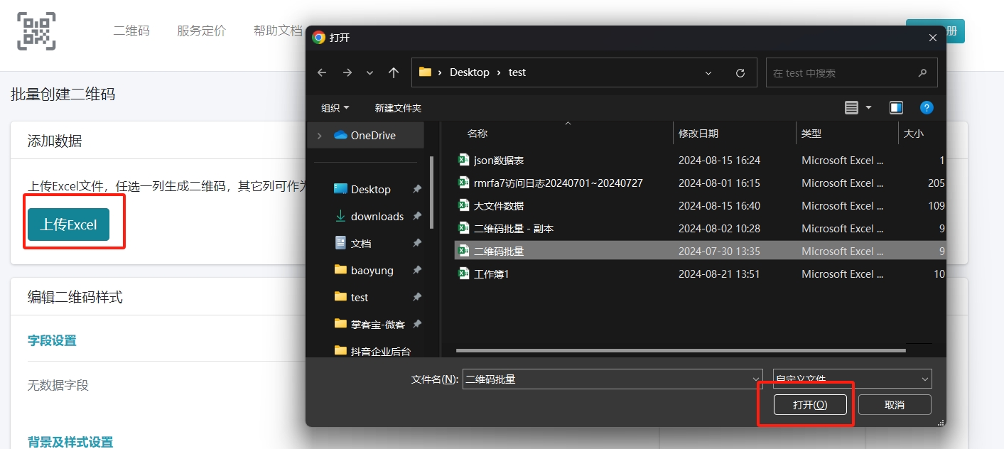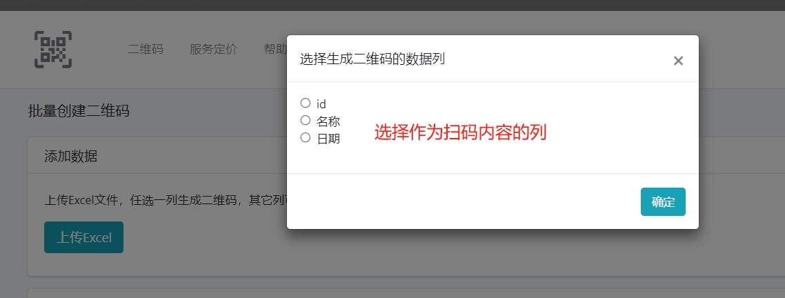 - 选择上传excel文件,请注意,excel文件第一行为标题行,不作为二维码数据