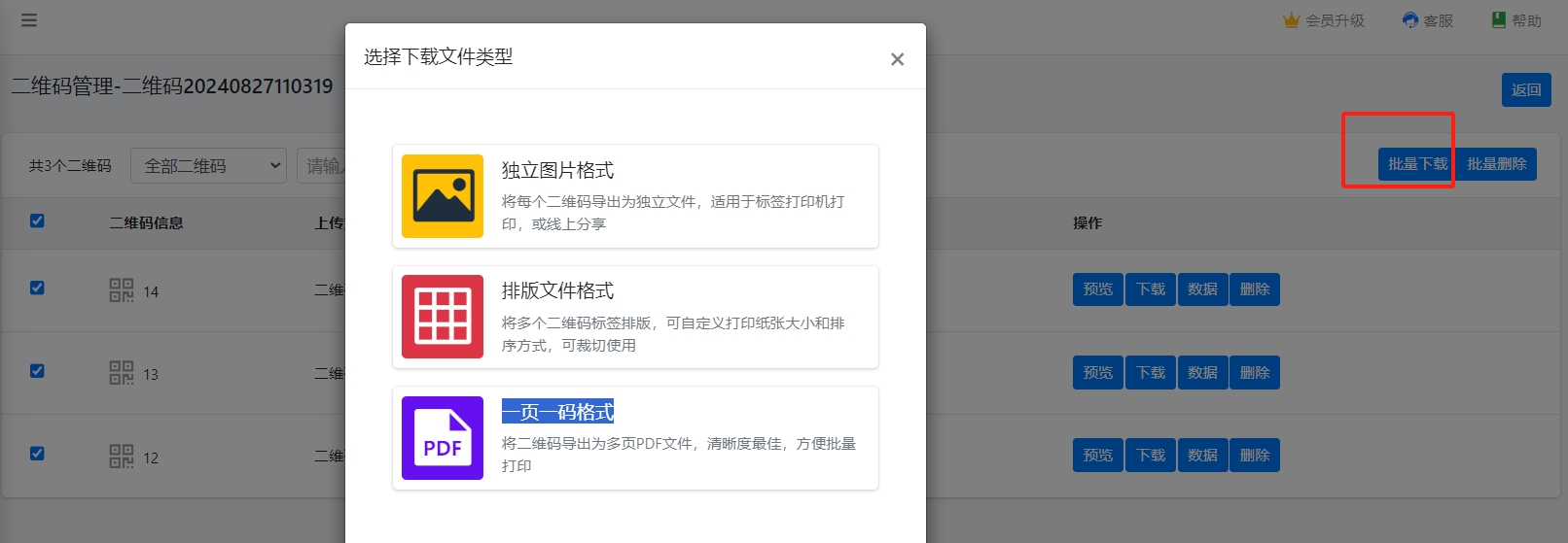 - 根据需求选择下载文件格式:【独立图片格式】为图片的Zip包;【排版文件格式】为多行多列的pdf文件;【一页一码格式】为一页一个二维码的PDF文件