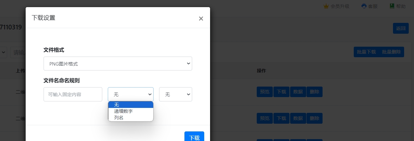 - 如果为【独立图片格式】zip包,可以给每个二维码图片文件命名规则,可以自动递增数字,或者某个列名