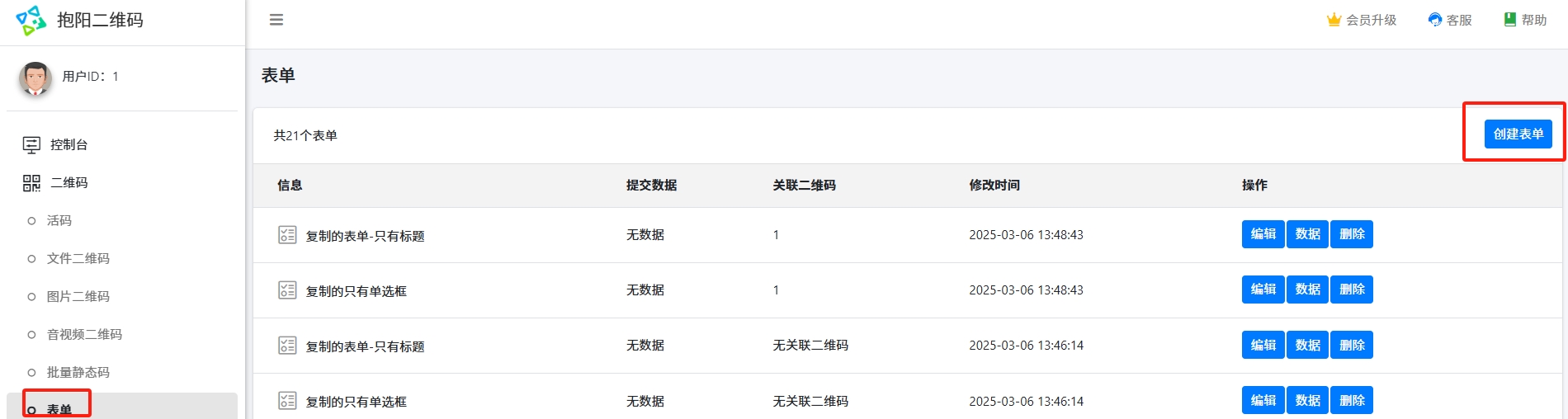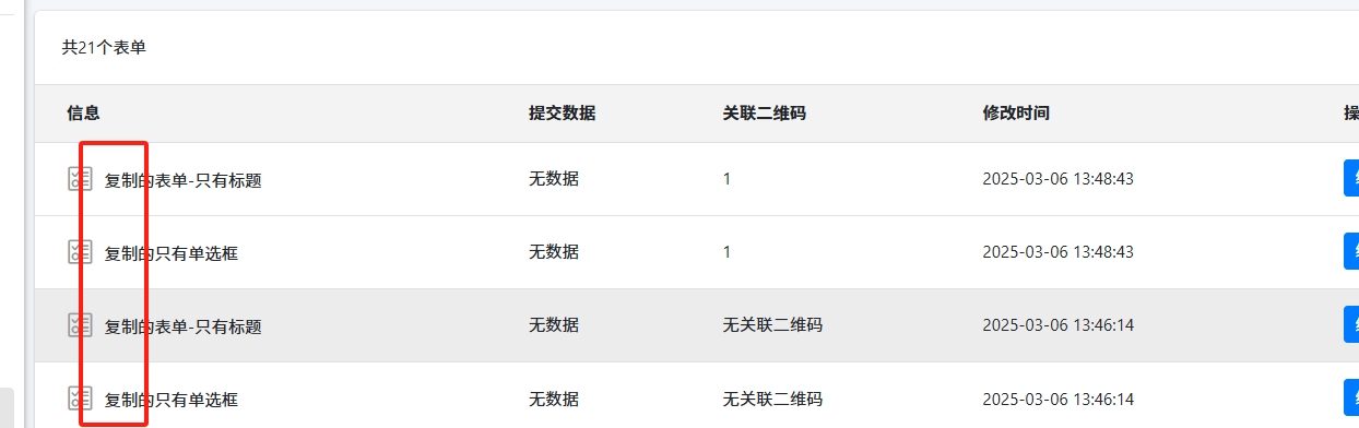 如果模板库中的模板包含表单,创建二维码时也会自动复制表单;复制的表单名称会自带”复制“,你可以自行修改